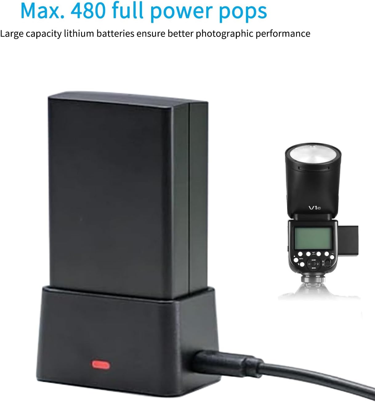 آنچه این فلاش و دیگر فلاشهای روی دوربینی سری V را از دیگر فلاشهای گودکس متمایز میسازد، استفاده از یک باتری لیتیومی بجای چند باتری قلمی است. فلاش V1 گودکس با هر بار شارژ باتری 2600 میل آمپری خود قادر به 480 بار تخلیه با قدرت کامل میباشد که این رقم نسبت به هر فلاش دیگری که باتری قلمی کار میکند بیشتر است. از دیگر مزایای باتری لیتیومی میتوان به اعلام صحیح میزان شارژ روی صفحهنمایش و همچنین مدتزمان آمادهسازی مجدد حداکثر 1.5 ثانیهای اشاره کرد که این مورد نیز برخلاف فلاشهای عادی، تا آخرین لحظه تغییری نخواهد داشت. همچنین باید توجه داشت که این عدد 1.5 ثانیهای برای استفاده از حداکثر قدرت است و در صورت استفاده از قدرتهای پایینتر، کوتاهتر خواهد بود. فلاش گودکس V1 علاوه بر چشمی اپتیکال برای هماهنگ شدن با دیگر فلاشها، از سیستم وایرلس سری X گودکس هم بهعنوان گیرنده و هم فرستنده پشتیبانی میکند. این به معنای سازگاری کامل با تمامی فرستندههای سری X مثل X1 و X2 و XPro و همچنین امکان کنترل دیگر فلاشهای سازگار این سیستم 2.4 گیگاهرتزی تا فاصله 100 متر است. این فلاش از ارتباط کابلی با دیگر گیرندههای موجود در بازار نیز پشتیبانی میکند. دمای رنگ نور فلاش V1 گودکس 5600±200درجه کلوین اعلام شده و روی این فلاش یک لامپ LED کوچک با دمای رنگ 3200K مشابه آنچه معمولاً بهعنوان فلاش گوشی موبایل دیدهایم، نصب شده است که میتواند در فواصل کم بهعنوان لامپ مدلینگ و برای تشخیص جهت دقیق نور و سایهها کارایی داشته باشد. علاوه بر شارژر و باتری Godox VB26 یک کیف حمل و پایه رومیزی به همراه فلاش V1 ارائه شده و وزن آن نیز با باتری نصبشده داخل بدنه 530 گرم است. درمجموع میتوان Godox V1 را یک فلاش ایده آل برای عکاسان حرفهای خصوصاً درزمینهٔ مدلینگ محسوب کرد که علاوه بر امکان استفاده بهصورت روی دوربینی، در حالت جدا از دوربین نیز حتی بدون نصب هیچ اصلاحکننده نوری میتواند عملکرد مناسبی داشته باشد و علاوه بر همه اینها در صورت استفاده در کنار فلاشهای استودیویی گودکس میتواند بهعنوان فرستنده نیز مورداستفاده قرا گیرد.
