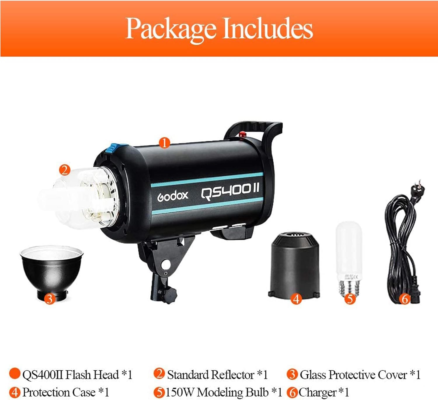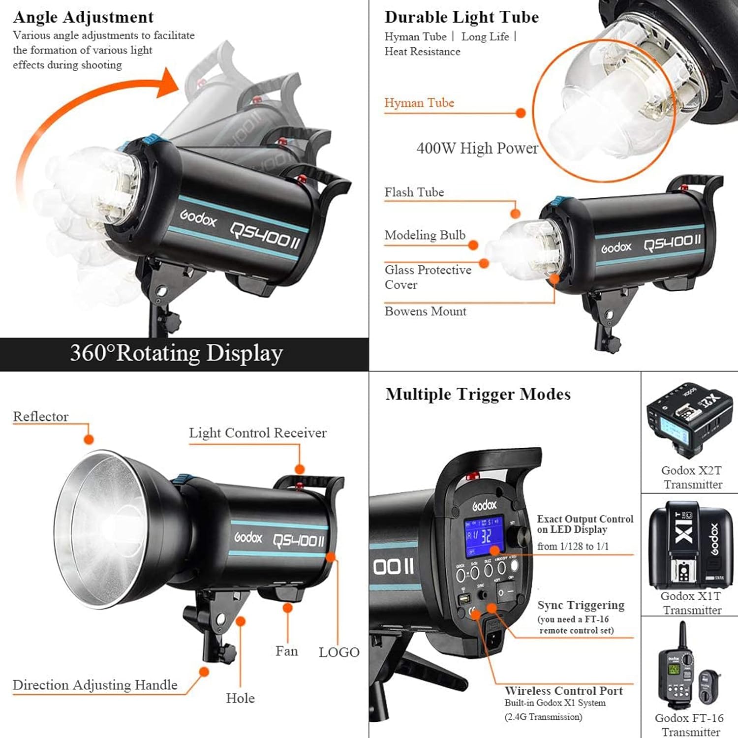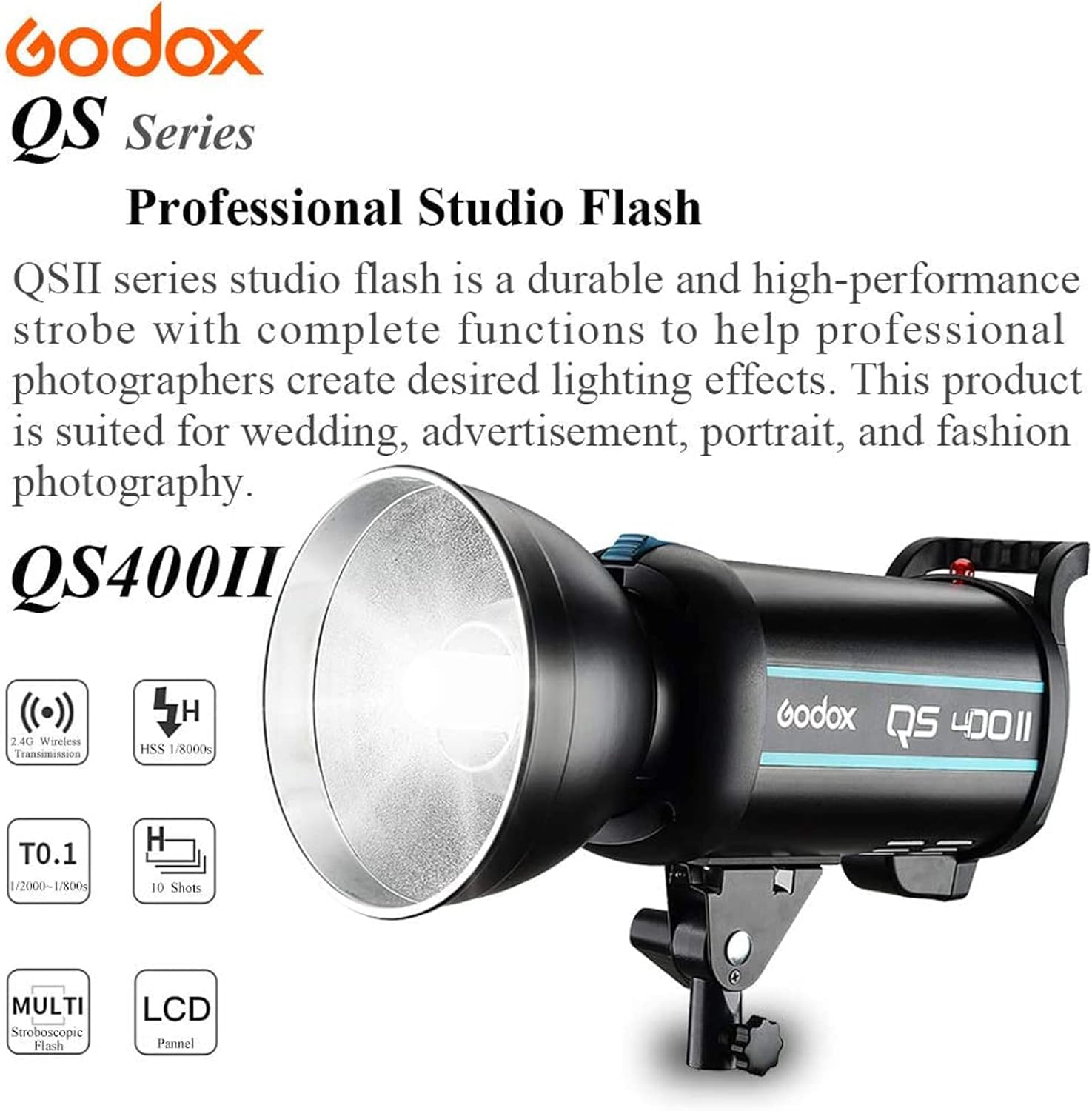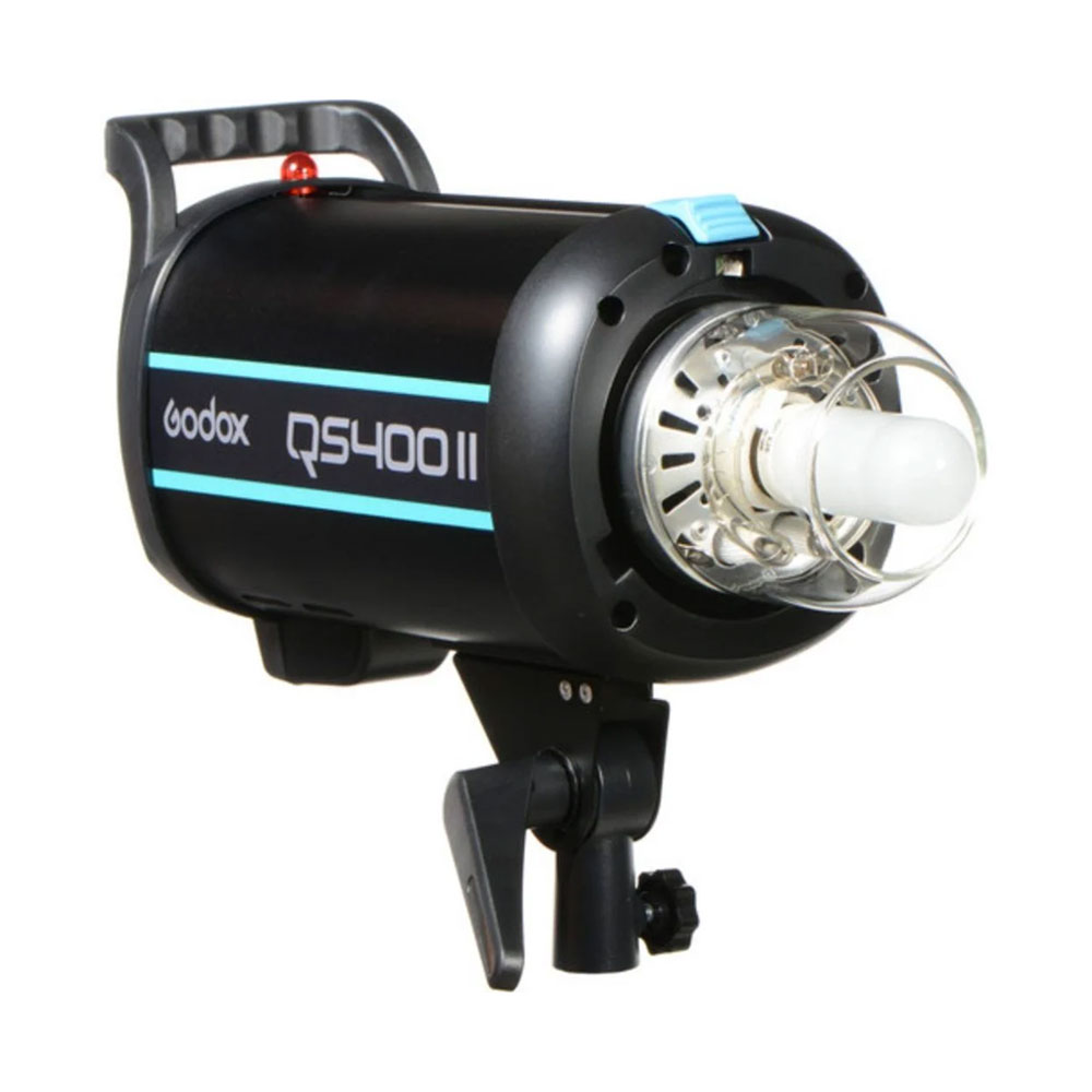 تنظیمات دستی فلاش شامل دکمهی تست و کش مکانیکی مخصوص همگامسازی هم در دستگاه تعبیه شده است. Godox QS400 II یک سیستم رادیویی ۳۲ کاناله X1 هم دارد که کنترل عملکردی بیسیم را امکان پذیر میکند. این سیستم که XT16، FT16 یا فرستنده X1 نام دارد، باید بهصورت جداگانه خریداری شود. وجود قابلیت عملکردی anti-pre-flash در این فلاش سبب میشود که کار با دوربینهای point-and-shoot و دیگر دوربینهایی که pre-flash را بهکار میبرند، سادهتر باشد. فلاش Godox QS400 II تقریبا ۲ کیلوگرم و ۷۰۰ گرم وزن دارد، بنابراین مونتاژ کیتهایی که از سر فلاش ۲ یا بیشتر برخوردار هستند، بدون داشتن یک پایه جانبی سنگین در کنار این فلاش، راحتتر خواهد بود. این فلاش از یک پایه جانبی Bowens هم برخوردار است که برای استفاده از اصلاح کنندههای شرکت سازنده یعنی گودوکس کاربرد خواهد داشت. البته از دیگر لوازم جانبی شرکتهای دیگر هم میتوانید استفاده کنید و این سیستم از تولیدات اکثر کارخانهها پشتیبانی میکند. سر فلاش دارای یک پایه ایستاده شیبدار هم است که روی ۱۰۰ الی ۱۲۰ منبع تغذیه اصلی VAC کار میکند.