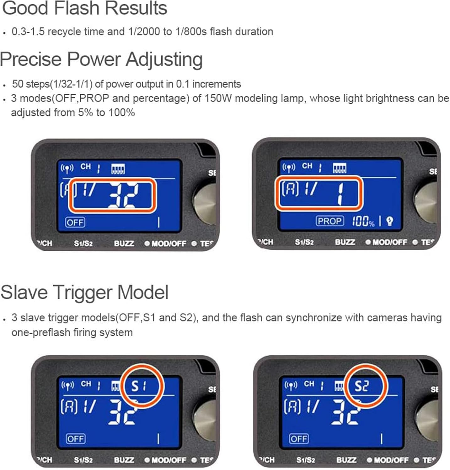 میزان نور مدل سازی شده این فلاش ۱۵۰ وات است که از یک حالت Proportional هم برخوردار است. این حالت کمک میکند که نور در حالت مناسبی قرار بگیرد. حالت دیگری بهنام Percentage هم وجود دارد که وظیفه تنظیم روشنایی فلاش از ۵ درصد تا ۱۰۰ درصد را برعهده دارد. این تنظیمات را میتوانید از طریق دکمههای فشاری پنل عقبی فلاش Godox QS400 II انجام دهید و صفحه نمایش LCD مخصوص فلاش هم که قابلیت خوانایی بسیار بالایی دارد، همهی اطلاعات لازم را نمایش خواهد داد.