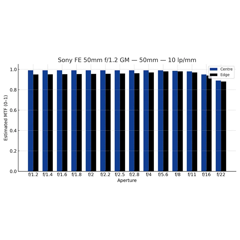 نمودارهای MTF (Modulation Transfer Function) برای این لنز نشان میدهد که انتقال کنتراست و شارپنس در مرکز و لبهها حتی در f/1.2 در سطح بسیار بالایی قرار دارد. خطوط MTF تقریباً صاف و پایدار هستند و این یعنی لنز برای سنسورهای رزولوشن بالا مثل Sony A7R V با ۶۱ مگاپیکسل یا حتی نسلهای آینده هم کاملاً آماده است.